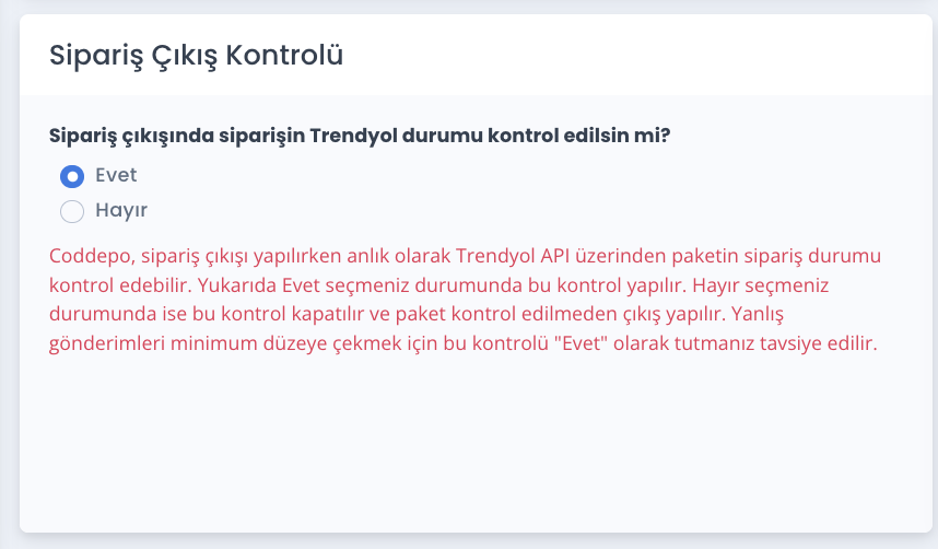 Sipariş Çıkış Kontrolü -> Evet ise, sipariş çıkışı esnasında paketin durumu Trendyol'dan sorgulanacak anlamına gelir. Sipariş Çıkış Kontrolü -> Hayır ise, sipariş hiçbir kontrole tabi tutulmadan çıkış yapılacak anlamına gelir.