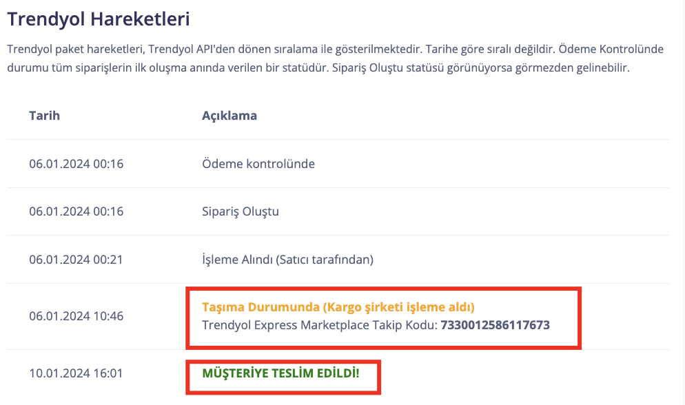 Trendyol hareketleri arasında zaten taşıma durumunda olduğunu yada müşteriye zaten teslim edildiğini gösteren bir ibare varsa, Sipariş Çıkış Kontrolü'nü kapatıp bu siparişin çıkışını yapabilirsiniz.